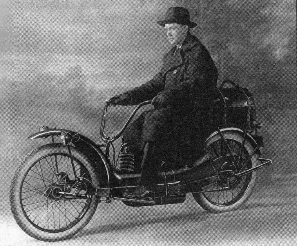 Ergonomiczna konstrukcja i funkcjonalny design. Metalowa osłona pokrywała prawie całą przednią część, zapewniając ochronę przed kurzem i błotem. Reflektor był zintegrowany z karoserią, zbiornik paliwa był ukryty z tyłu, a siedzenie miało sprężyny i elastyczną taśmę amortyzującą nierówności. Żaden element nie był umieszczony ze względów estetycznych: wszystko odpowiadało idei praktycznego i czystego środka transportu na co dzień. Nawet wysokie 26-calowe koła zostały zaprojektowane z myślą o ówczesnych wyboistych drogach.