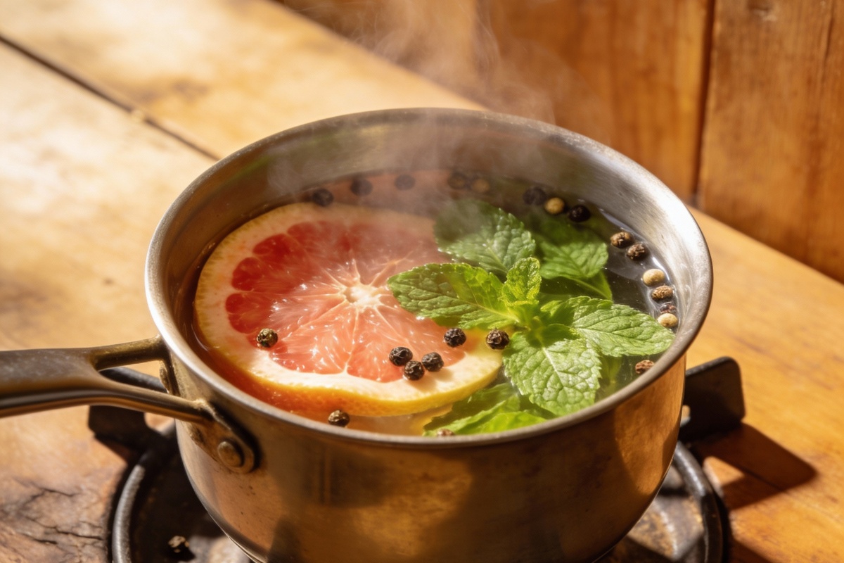 Za pripremu aromatičnog lonca preporučuje se uporaba manje posude s obiljem vode, dodavanje kore grejpa, metne i papra u zrnu te održavanje temperature na laganoj vatri. Važno je kontrolirati razinu vode i nadopunjavati je po potrebi kako bi mješavina ostala vlažna i ne zagorjela.