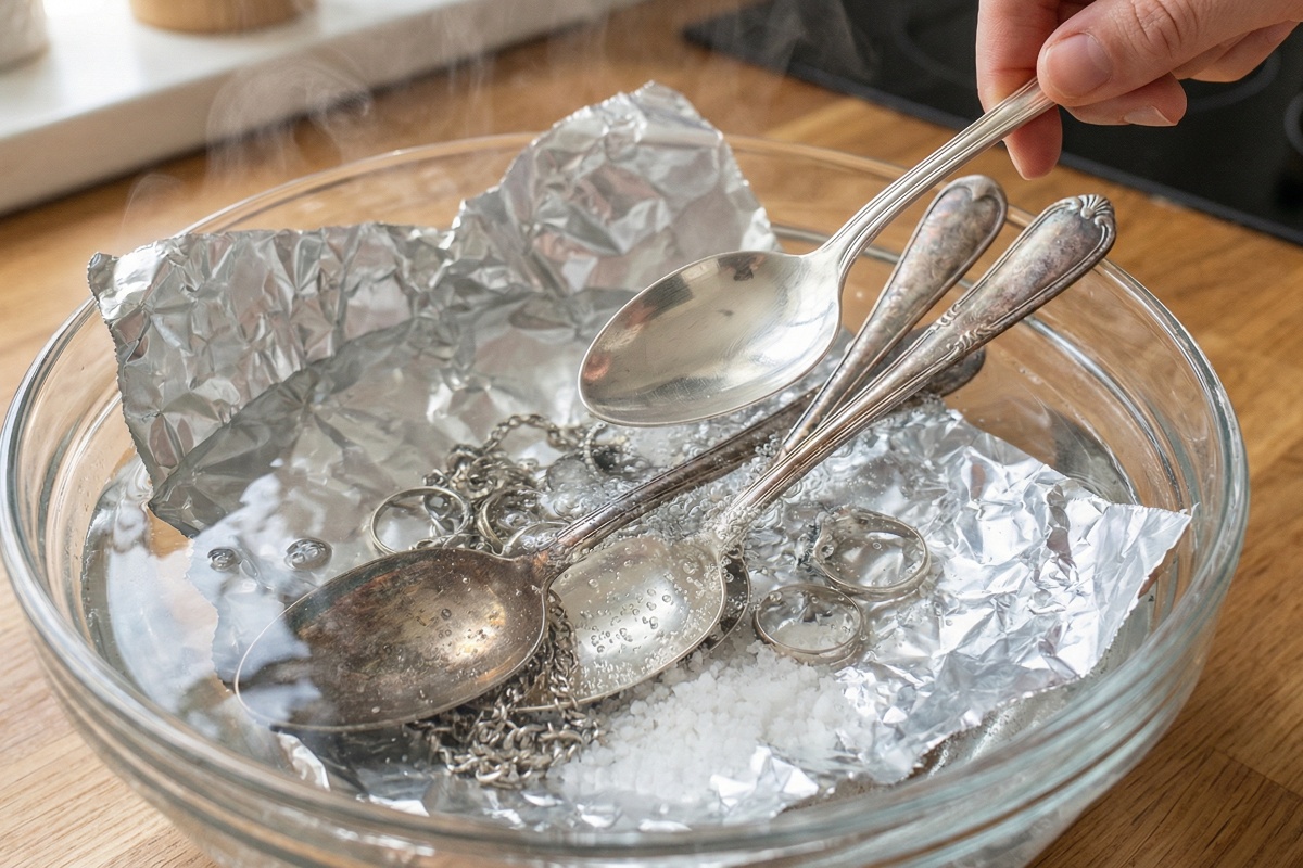 Otkrijte kako jednostavno i brzo očistiti pocrnjele srebrne predmete za samo 5 minuta, koristeći samo kipuću vodu, sol i aluminijsku foliju. Ovaj nevjerojatan trik koristi kemijsku reakciju koja vaše srebro vraća u prvobitni sjaj, bez muke i skupih sredstava.