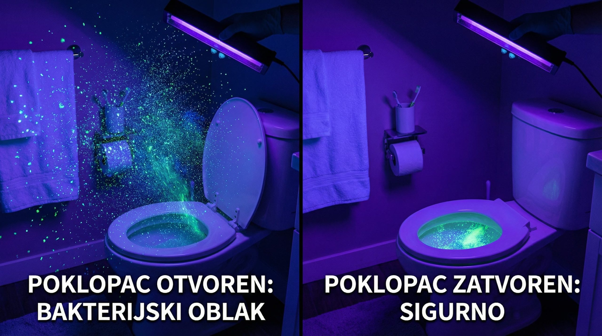 Znanstvenici i istraživači su, koristeći ultraljubičasto (UV) svjetlo, uspjeli vizualizirati ovaj inače nevidljivi fenomen. Fotografije snimljene pod UV svjetlom jasno pokazuju kako se oblak bakterija i čestica raspršuje iz WC školjke prilikom ispiranja kada je poklopac otvoren. Ove šokantne slike služe kao snažan podsjetnik na to koliko je važno promijeniti naše navike.